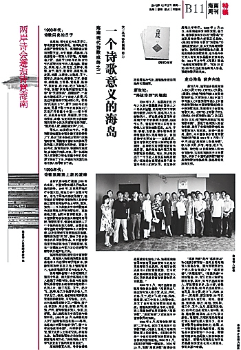 连续读了几期《海南周刊》,才发现那是一份集“新闻、新知、新生活”于一身的段位比较高的人文读物,也发现自己对海南日报副刊版“椰风”的注意力已被《海南周刊》“艺术”“悦读”“随笔”“电影”等几个板块吸去了一大半,同时,给《海南周刊》写稿子的意愿也自然而然地生发了——也许,那有点像风起云飞扬,或者日暖玉生烟……后来,我受托采访著名作家池莉,访谈短文《〈她的城〉写的是母性之美》及《〈她的城〉:对历史的反思 对未来的向往》发在2011年8月8日《海南周刊》“悦读”版;我读作家赵瑜新书简评《在〈小荒唐〉的文字沙滩上》发在2012年3月12日《海南周刊》“悦读”版;2012年12月03日,我为《海南周刊》写了“特稿”《一个诗歌意义的海岛》;次年12月,海口举办“跨越海峡的呼唤——2013两岸诗会”,我采访两岸诗会桂冠诗人姚风,访谈《姚风:让生命在诗意中灿烂》在2014年01月06日《海南周刊》“特稿”版印出来;2016年07月18日,我应约为《海南周刊》“悦读”版写了新书短评《〈南海更路簿〉:一部厚重的人文档案》……