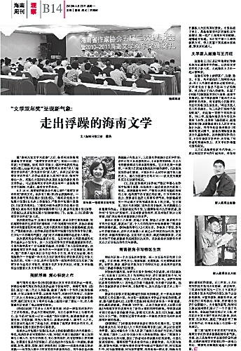 我与《海南周刊》的渊源,始于2012年,那年的4月23日,《海南周刊》发了海南日报记者蔡葩写的《“文学双年奖”呈现新气象:走出浮躁的海南文学》,这两期报纸,我一直保存。