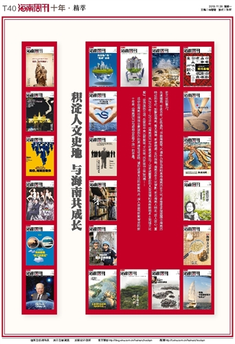 从2008年—2018年,《海南周刊》与时俱进推出了众多浓墨重彩的大型报道和具有鲜明本土地域文化特征的专栏,如解放海南、青天海瑞、家谱溯源、古村探幽、海南百年文化背影、宋元海南人物志、匠人匠心、重走滇缅路、辛亥百年、红色系列、书院海南等,不遗余力地弘扬和宣传海南历史文化,多维度多层面展示海南历史文化的魅力。