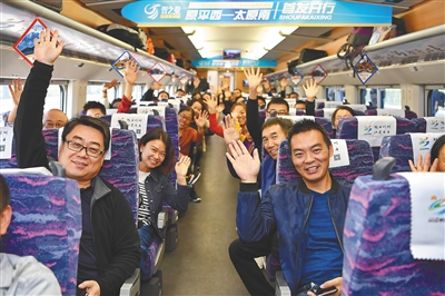 2018年9月28日,大(同)西(安)高铁原平西至太原南段开通运营。这是乘客在大西高铁原平西至太原南段首发列车上。 新华社记者 曹阳 摄
