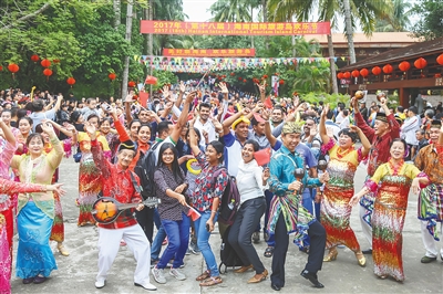 在万宁兴隆热带植物园,国内外游客随着音乐节奏跳舞狂欢。 本报记者 袁琛 摄