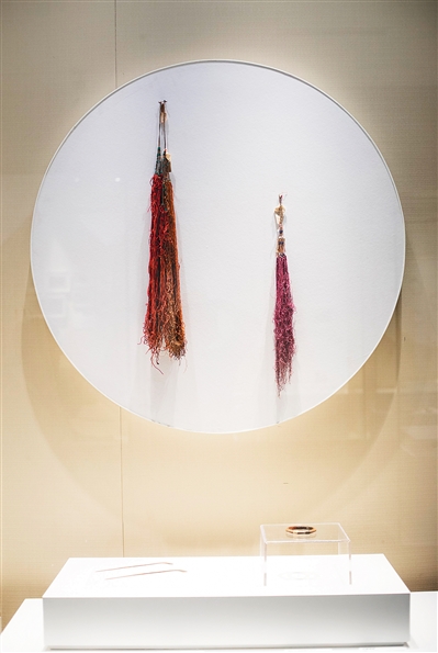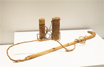 展出的一件藤编灯架也很有特点。上方打结的地方如现在常见的中国结,下方横置的木杆上放着灯座。据了解,当年,大家用蓖麻等植物籽榨油燃灯,而从上世纪30年代开始,煤油灯从汉族人聚集区逐渐普及,这样的灯架也就逐渐淡出了人们的生活。