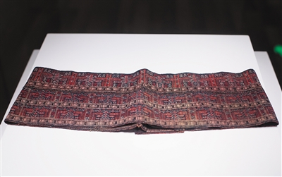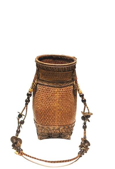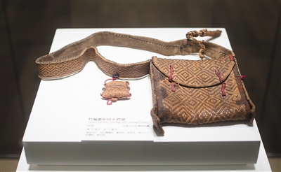 藤编腰篓是黎族人民生活中常见的物品,而此次展出的一个腰篓,其精美程度让省博物馆工作人员感叹。这个腰篓整体为胡桃木色,除了编织精细外,分层也十分整齐,底座由铜钱编制而成。值得一提的是,它的配绳上也对称缀有木质圆珠和铜钱,陈列在柜中如一件精致的摆设。