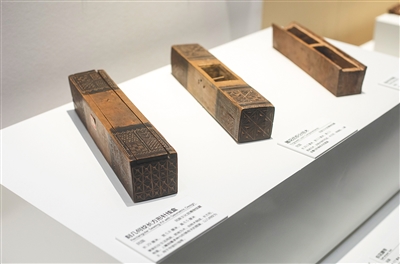 刻几何纹长方形针线盒、雕花纺织分经木、独木针线盒。