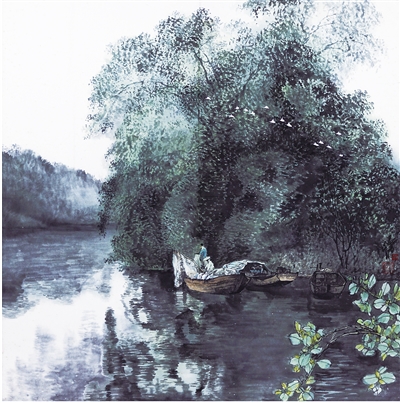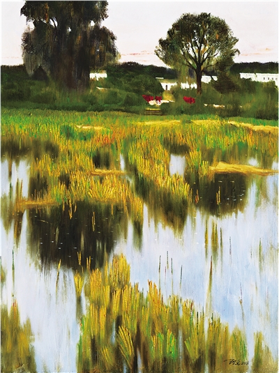 很多观展观众都注意到这幅作品,画家就画一小方水稻田,画面主要是一组镜像关系:树和它在水中的倒影。画家对金色、绿色以及对水纹的处理,让整个画面充满了优雅而细腻的质感,一种滋润可人的触感从画面中流溢而出。