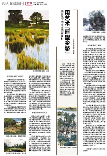 海南画家用朴实无华的笔触表达了内心的激情:有海边厚重的涛声,也有秋后雨水滴落的清脆;有在田野辛勤劳作的女人,也有路边歇息的慈祥老人;有村外的霭霭暮色,也有午后的明亮阳光;有墙角的闲暇小景,也有壮观的山间梯田;有“她家”的老院,也有“咱们”的鱼排。