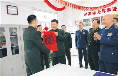 离开国旗中队,习近平来到支援保障大队警卫勤务一中队。他察看部队装备器材,了解警卫勤务情况。中队俱乐部里,战士们正在准备春节文艺节目,习近平来到这里,饶有兴致地观看了战士们自编自演的小合唱《张思德传人》,带头为他们鼓掌。习近平深有感触地说,部队文艺工作要树立为兵服务、为基层服务的导向,建设好文艺轻骑队,不断丰富基层官兵业余文化生活。上士袁文魁现场书写“福”字敬送习主席,表达战士们对习主席的新春祝福。随后,习近平前往战士餐厅,走进操作间,来到灶台前,关切询问平时伙食怎么样?年夜饭是怎么安排的?习近平叮嘱部队安排好战士们节日生活,让大家过一个欢乐、祥和、安全的节日。