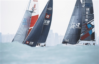 3月16日上午,参加海口场地赛的船队在海浪中追逐。 本报记者 宋国强 摄