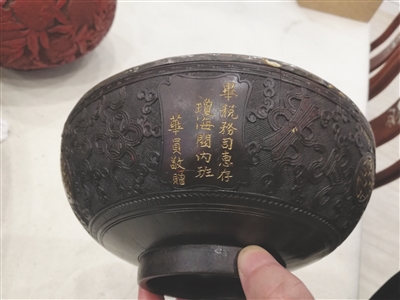 刘先生从古色古香的盒子中拿出椰雕银碗,繁复的暗八仙精致花纹,引来了啧啧赞叹。椰雕银碗是由半个椰壳制成,高7.5厘米,直径20厘米。尽管花纹中能看到历经岁月沧桑留下的稍许裂纹,但整体保留完好,弥留着历史的沉厚气息。椰雕银碗外部是手工全雕刻,花式纹理细腻逼真,栩栩如生;碗内侧则用银片粘贴,时间久了,银片有些发乌,但精美依旧。