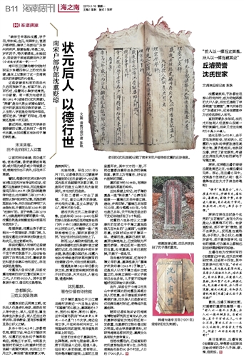 丘濬在他为沈悌所写的《世德堂记》中说,沈氏自宋朝到沈悌,已经有十四世,其中定居琼州已有六世,“世世以德相承,其为基也甚厚而固,至居士又能拓而大之,培而益之,虽功名事业,不逮昔人之显赫,然而赀产之丰,规模之远,先业赖以维持,后人得以凭藉,继此以起者,安知其无若秋涧翁(沈翥)者之出于其间哉?”