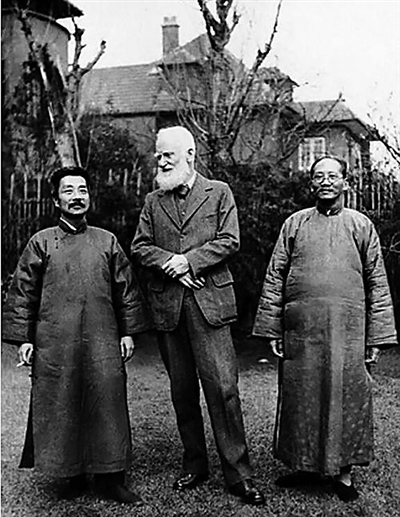 一九三三年,萧伯纳与鲁迅(左)、蔡元培(右)在上海宋庆龄住宅院内。