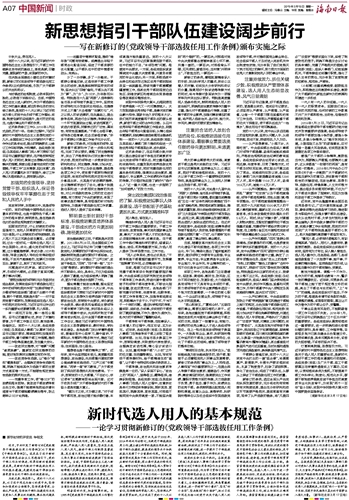 近日,中央印发了新修订的《党政领导干部选拔任用工作条例》(以下简称《干部任用条例》)。这是在习近平新时代中国特色社会主义思想指引下,党的干部工作与时俱进、改革创新的重要制度成果,是新时代做好干部选拔任用工作的基本遵循,是建设忠诚干净担当的高素质专业化干部队伍的制度保证。