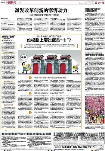 发展没有止境,改革永远在路上。实施更大规模的减税降费;改革高职院校办学体制,加快发展现代职业教育;深化“放管服”改革,着力优化营商环境;审议通过外商投资法,推动形成全面开放新格局……今年两会作出的一系列部署,突出问题导向,回应社会关切,坚持用深化改革、扩大开放的思路和办法破解发展难题。贯彻落实全国两会精神,就要聚焦重要领域和关键环节,扫除制约高质量发展的体制机制障碍,调动各方面抓改革落实的积极性,让发展活力竞相迸发、发展质量不断提高。