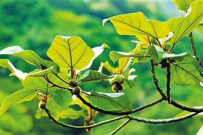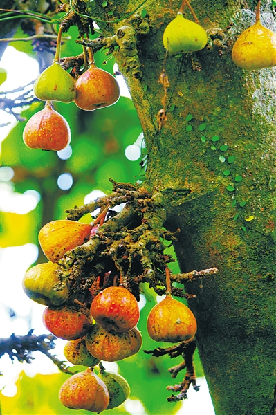 行至山林深处,一棵棵大叶水榕成片分布,只见一束束底部看似光秃秃的浅灰色树枝,顶部挂满了交错堆叠的树叶和无花果般的果子。可若要论果子,当属比邻而居的大果榕最为特别。这种叶片如大象耳朵的榕树,又名馒头果、大无花果、大木瓜、波罗果、蜜枇杷、大石榴,其果大如梨,味甜柔美,被当地群众称为“甜馒头”,也是“菩提榕”里唯一适合人类食用的榕果。