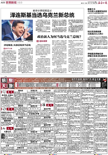 起初,当地媒体并不看好这位毫无政治经历的演员,批评他的竞选活动很不专业,但他的支持率却始终亮眼。到今年3月底的第一轮投票前,泽连斯基的支持率已经稳居首位,将总统波罗申科和前总理季莫申科这两位政坛老将甩在身后。