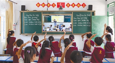 借助网络连线,地处偏远山区的陵水大里希望小学学生通过“同步课堂”与县城小学的学生同步上英语课。武昊 摄