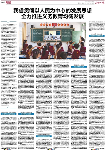 推进义务教育均衡发展没有终点,只有连续不断的新起点。在建设全岛自由贸易试验区和中国特色自由贸易港的大背景下,我省将始终坚持以人民为中心的发展思想,不断筑牢教育底线、加快均衡发展,给百姓带去更多获得感。