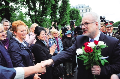 7月8日,在拉脱维亚首都里加的自由纪念碑广场,拉脱维亚当选总统埃吉尔斯·列维特斯(右)接受民众祝贺。 新华社发(亚尼斯摄)