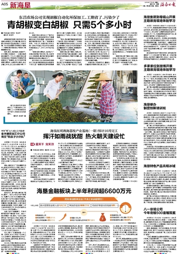 脱枝、熟化、脱皮脱胶、低温烘干、水分调解、风选除杂……正值东昌胡椒采摘季节,7月4日,海南日报记者在东昌农场公司刚刚投产的新型环保胡椒加工厂里看到,农户们送来的青胡椒无需泡水,全程自动化操作,经过多重工序后,加工成白胡椒只需5个多小时。