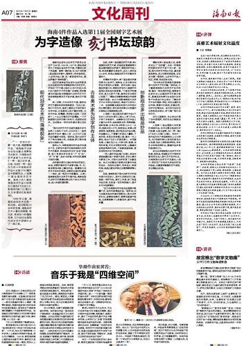 谈及未来海南现代刻字艺术的发展,陈洪说,希望更多艺术院校的青年师生加入现代艺术创作队伍,为海南现代刻字艺术发展注入活力,同时应广泛吸收兄弟省份的创作经验,丰富美学意蕴和艺术语言,多出精品出妙品。