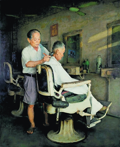 老式推子、旧电吹风、折叠剃头刀、铁制理发椅、斑驳的大镜片……海南画家梁峰的油画作品《祥和的日子》曾入选2014年第十二届全国美展,画中的理发店位于海南文昌抱罗镇,这家店和剃头师傅林鸿仍是很多老文昌人的岁月“记忆”,镇上的人都管林师傅叫“二公”,理发店也被街坊邻居亲切称为“二公理发铺”。