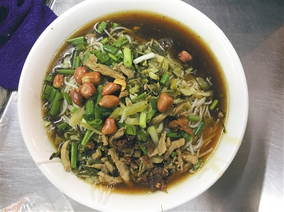 香炸酥肉是屯昌腌粉的最大亮点和特色,正宗的屯昌黑猪肉,再加上几种配料腌制后,油炸而成,一口下去浓郁香酥。腌粉中还会加入酸菜和芝麻,酸菜是店家自家腌制的,腌制时间长,味道酸劲,恰恰是这种酸味中和了粉的油腻。粉店老板对海南日报记者说,腌粉都是当天做当天卖完,香炸酥肉也都是当天送来的新鲜食材,建议吃粉时加入海南独特的黄灯笼辣椒或者店家配的蘸料,立马能唤醒你的味蕾。