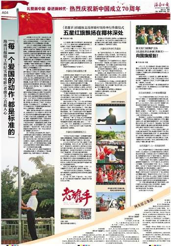据了解,这部微电影是海南日报献礼新中国成立70周年之作,微电影以厚禄村这个远近闻名的“国旗村”为原型,以小见大,用真实质朴的小故事烘托大主题。据主创人员介绍,这部微电影的亮点,在于老村长和原天安门国旗护卫队退伍老兵的故事碰撞,无论是“老村长”对升旗的执着,还是退伍老兵向国旗报到,都传递出对祖国的热爱,正如片尾所说,“每一个爱国的动作,都是标准的。”