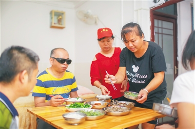临近中午,吴海波从位于琼山区凤翔东路的家坐公交车去龙昆南路金竹园小区的按摩店,为丈夫符勇准备午餐。每周,符勇会回家与妻子、孩子团聚一次,其余时间都是吴海波来回两头奔波,在家照顾老人和孩子的饮食起居,时不时照顾丈夫符勇的生活。