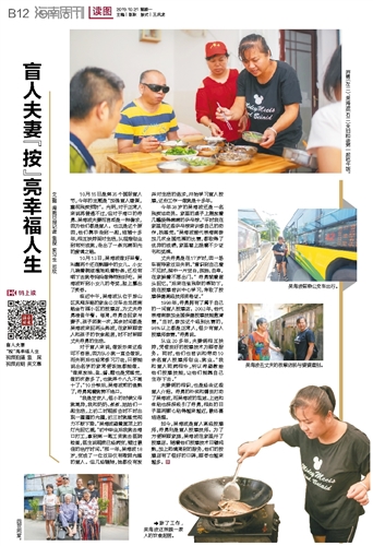 文\图 海南日报记者 袁琛 实习生 邓欣10月15日是第35个国际盲人节,今年的主题是“加强盲人康复,重视残疾预防”。光明,对于正常人来说再普通不过,但对于海口的符勇、吴海波夫妻而言却是一种奢求,因为他们都是盲人。也正是这个原因,他们携手走到一起,结婚十多年,相互扶持面对生活,从艰难创业到有所成就,走出了一条充满阳光的爱情之路。
