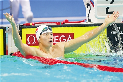 中国选手汪顺在男子200米个人混合泳决赛后庆祝胜利。