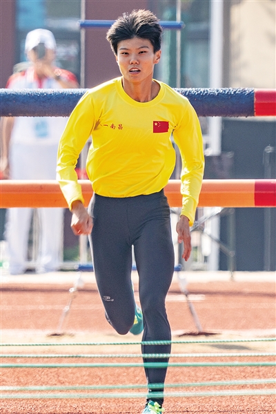 中国选手卢嫔嫔在军事五项女子个人全能障碍跑比赛中。