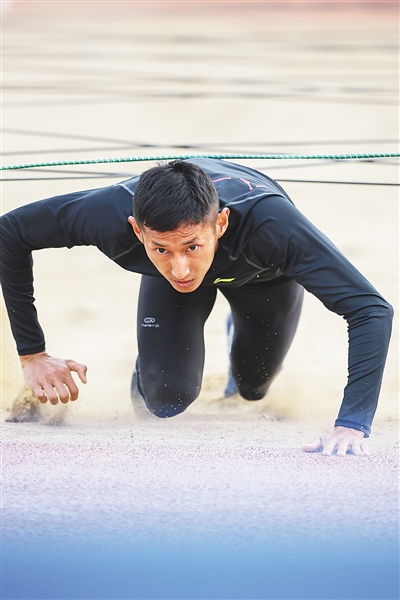 中国选手潘玉程在军事五项男子个人全能障碍跑比赛中。