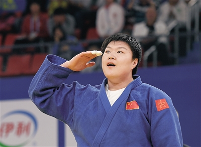⬅ 中国选手王彦在柔道女子七十八公斤以上级决赛夺金后致意。