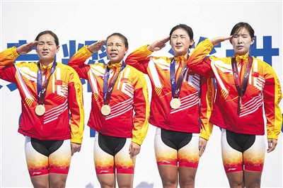 中国队选手梁洪玉、普译娴、孙佳君、赵茜沙(由左至右)在公路自行车女子公路团体决赛颁奖仪式上敬礼。