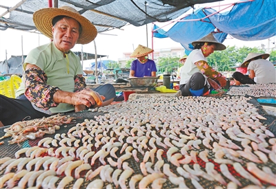 10月24日,在临高县新盈镇中心渔港,当地渔民在加工海鲜干货。据介绍,近年来,新盈镇大力发展海鲜产品加工产业,产品远销省内外各大城市。产业发展也带动该地贫困户劳动力就业,帮助贫困户摘掉贫困帽子。本报记者 陈元才 摄
