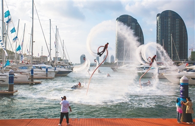 本报三亚12月13日电 (记者李艳玫)“虽然没有浪,但是照样可以凌空飞行于海面之上,享受到冲浪的乐趣。”12月13日下午,在三亚鸿洲国际游艇码头,几名游客正在体验电动水翼冲浪板,这是一款打破场景和技术局限性的高科技产品。当天,第十届海天盛筵在这里开幕。游艇、直升机、跑车等丰富多样的展品与市民游客见面,让大众体验时尚前卫的“海陆空”休闲生活方式。