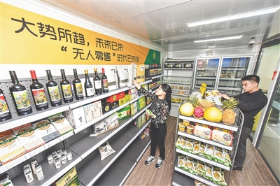 12月13日,海南国际会展中心,无人值守智能便利店吸引顾客前来购买。 本报记者 袁琛 摄