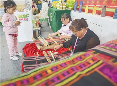 在海南农垦馆,黎锦现场编织吸引市民。本报记者 袁琛 摄