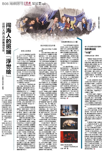 在《大海》中,邓菡彬通过音乐剧、话剧、相声剧、影戏、偶戏、舞蹈剧场、电影剧场等不同手法,和歌剧、山歌小调、电子迷幻乐、说唱等音乐形式,以一个背着吉他走天下的男青年为主线,展示出了一幅闯海人跌宕起伏的“浮世绘”。“那个年代的故事很丰富,我们要通过故事、台词、表现形式、场布等各种因素,构建出时代的环境,让观众感受到那个年代的斑斓,变成闯海‘浮世绘’的一部分。”邓菡彬说道。