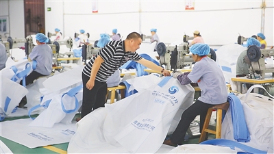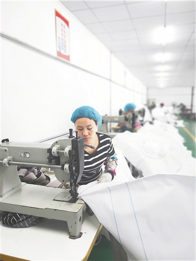 2019年12月27日上午,在位于儋州大成镇新风村附近的伟达化工就业扶贫车间里,传出一阵阵整齐而密集的缝纫机声,近70名女工熟练地操作着缝纫机。