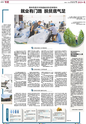 “能在家门口就业真的很方便,不仅能挣到钱,还可以照顾家里。”2019年12月27日,在海南金通农业开发有限公司扶贫产业基地,儋州市中和镇水井村村民羊雪香笑着说,自从“家门口”有了扶贫基地,村里好多人来此务工,不用再外出打工了。创建扶贫基地(车间),助力贫困劳动力就近就地就业,只是儋州全面推进就业扶贫工作的一个缩影。近年来,儋州以促进就业创业、技能培训、劳务输出和兑现就业扶贫政策为抓手,完善政策措施,创新工作机制,推动就业扶贫取得了较好成效。数据显示,2019年,儋州市实现贫困家庭劳动力转移就业4374人,完成年度下达3000人任务的145%。