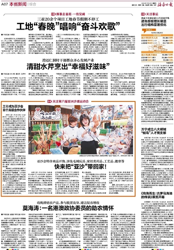 作为一名省政协委员,莫海涛积极履行参政议政职责,年年关注“三农”发展,先后围绕美丽乡村建设、远海渔业生产、乡村教师建设等工作提出多份提案,为相关部门科学决策提供了参考。1月17日,在省政协七届三次会议第二次全体会议上,莫海涛作了题为《多措并举促进农民增收》的大会发言。“2019年,在全球经济普遍下行的背景下,海南农产品价格走低,农业生产成本提高,特别是受非洲猪瘟的影响,许多农户的收入不增反降。”莫海涛建议,要加强乡村振兴立法与顶层设计,鼓励有资金、有文化、懂技术、善经营、会管理的城里人到农村的广阔天地去干事创业,带动农民增收,“同时还要注重调整农业产业结构,充分挖掘本土文化资源,打造特色扶贫产业。”(本报嘉积1月22日电)