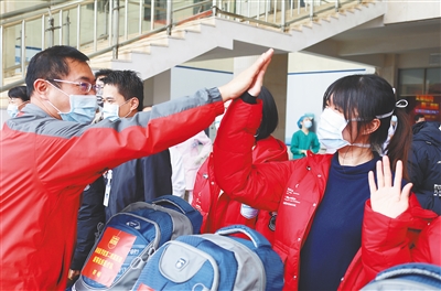 2月21日,在海南医学院第二附属医院,省第七批援助湖北防控疫情医疗队队员王苑菲(右一)即将出发,和送行的同事击掌告别。 本报记者 李天平 摄
