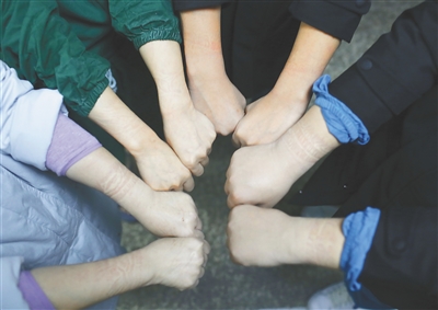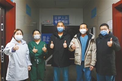 图①为医护人员全副武装。图②为走出隔离病房的海南医护人员手臂上的勒痕。图③为五位来自海南的医护人员走出隔离病房后点赞报平安。本报特派记者 袁琛 摄