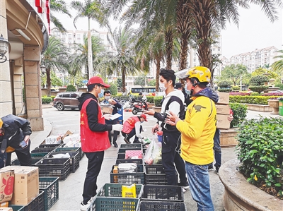 2月21日,在海口市琼山区博桂社区江畔人家小区的大门口前,13名来自“云开见日”社团的新时代文明实践志愿者戴着小红帽、身披红马甲来回穿梭将一个个包裹、一袋袋蔬菜等物品贴上标签并放到相应楼栋的箩筐里。一辆电瓶车从小区内驶出,志愿者们又立马忙着将箩筐里物品按楼栋号搬运上车,跟随小区保安将物品送至小区内各单元。