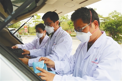 苏新元(右一)和同事整理装备,准备赶赴下一个流调现场。 省疾控中心供图