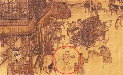 清明上河图里的“脚店”(左下角)和“外卖小哥”(红圈)。