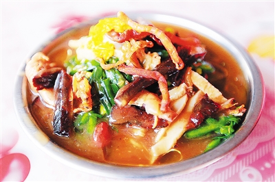 猪肉丝、花生米、鱿鱼干、虾米、豆角、酸菜、米糟……一个白瓷碗中,如玉般晶莹的米烂搭配上这些个配料,似乎有了生命和灵魂,最后再浇上香喷喷黄澄澄的蒜头油,米烂就更出味。