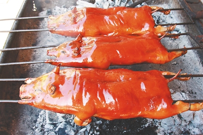 到东方游玩,首先不可错过的美味就是四更烤乳猪。四更烤乳猪据说有300年历史,原料来自东方四更镇,哺乳期30天左右乳猪,重量约为2至4斤,这时的乳猪还未长脂肪,肉质较嫩。整猪用当地配制的佐料浸透后,用木炭烤熟,具有皮脆、肉香、味美、色艳的特点,是当地招待贵客的上等菜肴。蘸上白糖后,一口咬下赤红的脆皮,烤猪肉的熏肉味和香料味弥漫在嘴里。