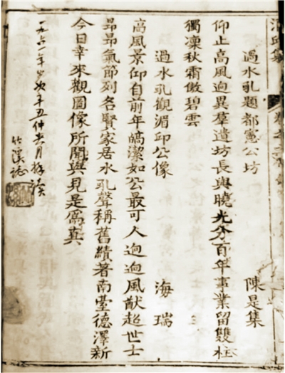 2017年我省在进行全国古籍普查时,发现文昌市图书馆珍藏的古籍——清道光年辛丑 (1841) 琼州府文昌邢氏宗祠刻本《湄丘集》附录卷有明海瑞撰七言律诗《过水吼观湄丘公像》一首,全诗如下: